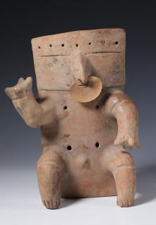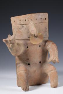 Colombia, a terracotta seated slab figure in Quimbaya style 20th century.