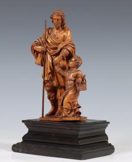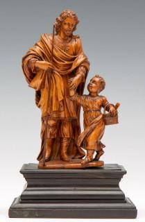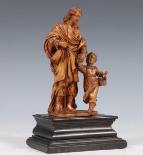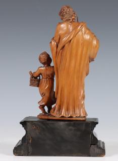Jozef met Christus als kind aan de hand. Kind met mand in hand. Fraaie detaillering (de plint met restauratie). Op zwart houten sokkel. Met aankoopnota Sotheby's veiling 130, 24-4-1980