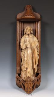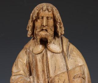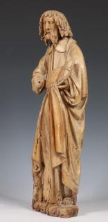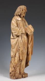 Heilige Jacobus Major, fraai gestoken gezicht, boek in zijn linker hand (rechterhand mist, verweerd) Provenance: Kunsthandel A.J. de Raad, Rosmalen. In latere eikenhouten nis in Gothsiche stijl