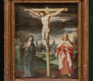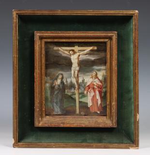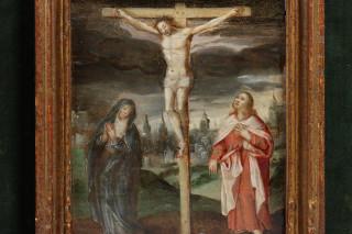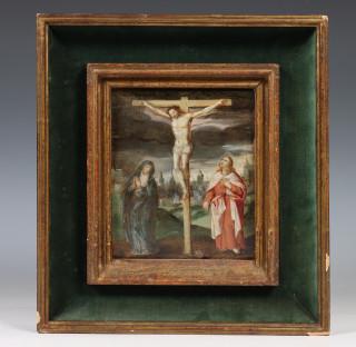 Golgotha. Christus aan het kruis geflankeerd door beide Maria's. In deels getoffeerde en verguld houten lijst Volgens notitie aangeschaft in 1998