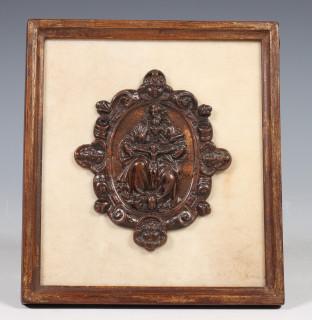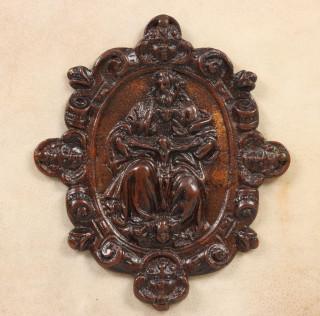 met reliëf van de Heilige Drievuldigheid ofwel Genadestoel; God de vader gezeten met gekruisigde Christus op schoot en duif als Heilige Geest. De rand met rolwerk en mascarons. Gemonteerd op omlijsting. Met aankoopnota 2003 Remco van Leeuwen Antiquair, Eindhoven