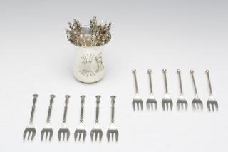 Set van twaalf apostellepels, twee diverse sets taartvorkjes en lepelvaasje,