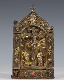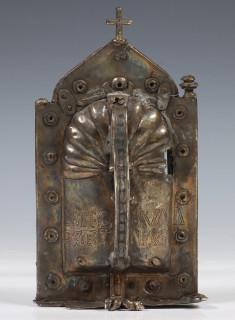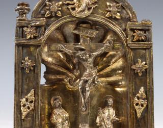 in de nis Chistus aan het kruis, geflankeerd door Maria en Johannes. De rand versierd met rozetvormige appliques en 'fleur de lis', in de plint één ingelegde bloedkoraal. Onder het kruis op de boog reliëf met Maria Immaculata. De achterijzde met handgreep en gegraveerde takst ESTED IOIVAJA ..VINAGRE (één pinakel mist, gaatje in de schelpvormige achterwand) Provenance: Sotheby's Amsterdam, 20-21-2000, lot 31