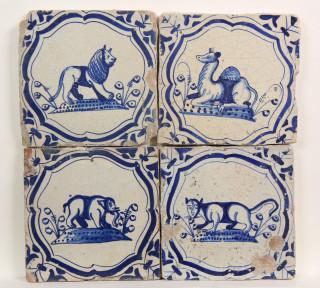 Vier blauw aardewerk dierdecor tegels, ca. 1625-1650;