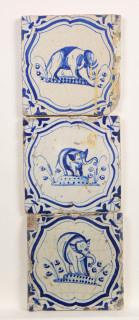Drie blauw aardewerk dierendecor tegels, ca. 1625-1650;