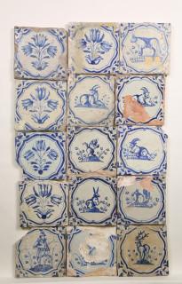 Dertig blauw aardewerk tegels ca. 1625-1650 .