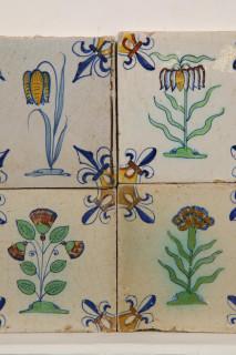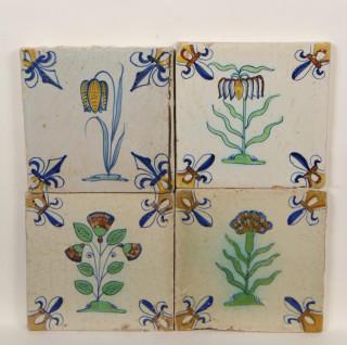 Vier polychroom aardewerk bloemendecor tegels, ca. 1620-1650;