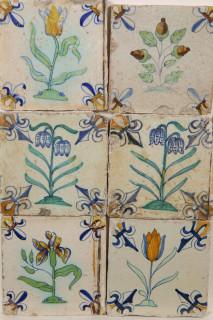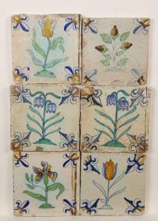 Zes polychroom aardewerk bloemendecor tegels, ca. 1620-1650;