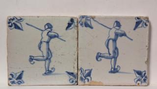 Twee blauw aardewerk figuurdecor tegels, ca. 1620 - 1650;