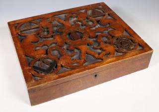 De ajour gezaagde deksel uitgevoerd met symbolen en geschilderde tekst: Derbyshire, Bro. H. T. Wade. Met blauw zijde interieur.