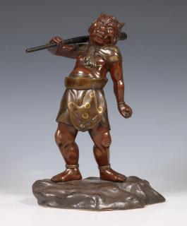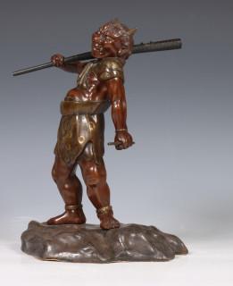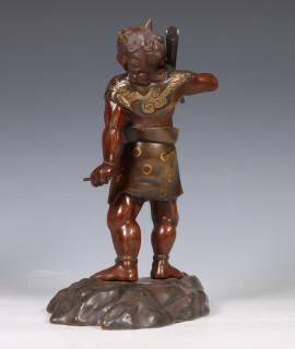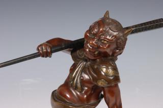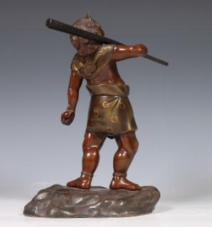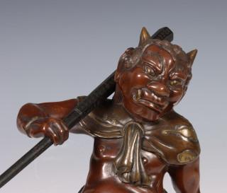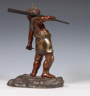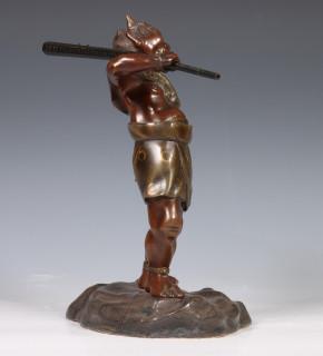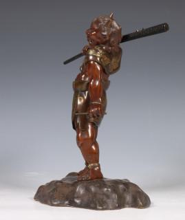Japan, patinated bronze figure of an Oni, circa 1900, carrying a large club over his shoulder, with detailed dress and facial features (some scratches)