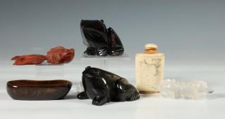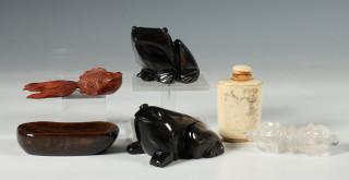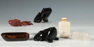 twee van een kikker, een van een goudvis, een stenen bakje, een ivoren snuifflesje en een vajra
