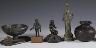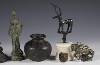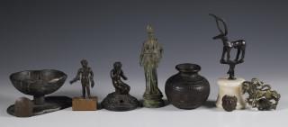 o.a. twee Klassieke stijl bronzen beeldjes en een koperlegering plaquette van een schild dragende leeuw.