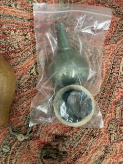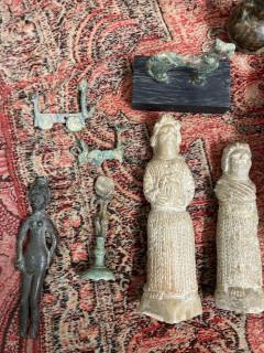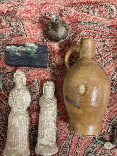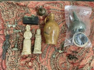 o.a. albasten vrouwfiguren, glazen kommetjes, bronzen Romeinse stijl figuren en Midden Oosten stijl bronzen sculpturen van paard met wagens. Hierbij Thailand Swankalok kom en Duitsland, steengoed vaasje