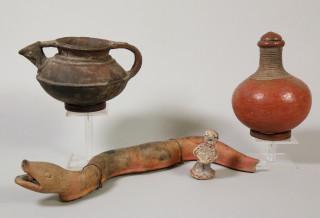 Vier ceramische objecten; Zuidoost Azie, koperen ketel en BriFour ceramic objects; Southeast Asia brass kettle and a Brazilian terracotta, deocrated snake,