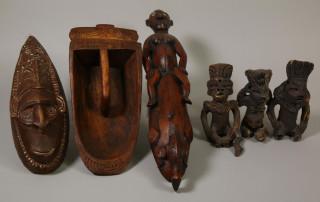 Three decorative Sepik style wooden objects; a mask, a canoe scoop and a souvenir.