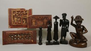 Asia, eight various wooden objects, Indonesia, fisherman statue and China, three panels.
