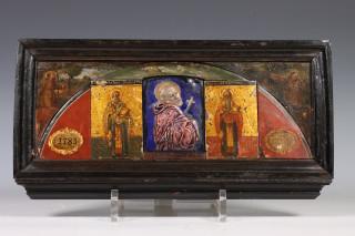Frontpaneel mogelijk van kunstkabinet, 17e eeuw met later ingezette Griekse emaille plaquette en drie Griekse houten paneeltjes, 18e eeuw,