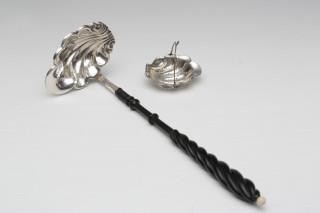 bak in schelp vorm met getordeerd gezwart houten steel met benen knopje, zeefje in schelpvorm met hengsel geen jaarletter aangetroffen, mt. Johannes Lambertus Kroymans, 1877 Oss/Schijndel, 2e gehalte,