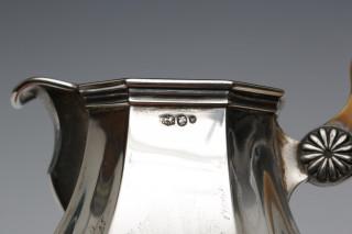 bestaande uit theepot, melkkan suikerpot met deksel en lepelvaasje, omgekeerd balustervormig model met afgevlakte hoeken, ivoren grepen voluutvormige grepen mt. K.N.E.B, Fa. J.M. van Kempen, Begeer & Vos 1930 Voorschoten, 2e gehalte,
