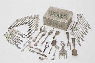 Sigarendoos met oud-Hollandse voorstelling versierd en divers klein zilverwerk,