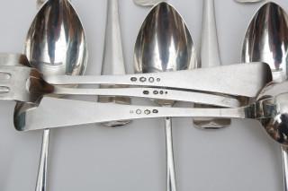 bestaande uit acht dinercouverts en acht dessetcouverts, soepopdienlepel, aardappellepel en groentenlepel, één dessetvork ontbreekt, mt. Huisman n.v 1962 Schoonhoven, 2e gehalte,