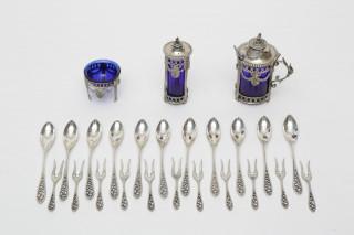 met blauw glazen binnenbakjes, hierbij set theelepels en zuurvorkjes met ajour steel uiteinde, mt. Zaanlandse Zilversmederij 1920-1990, hierbij