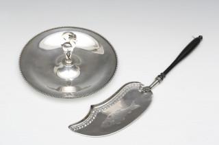 Ajour visschep, 19e eeuw en verzilverde koekjesschaal met steenbokvormige houder,