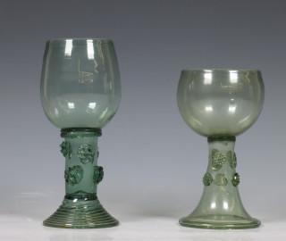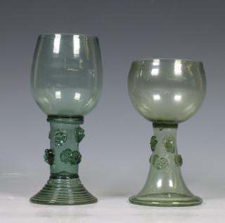 één met hoge smalle kelk, holle stam met geribbelde voet, de ander met holle stam en uitlopende voet.