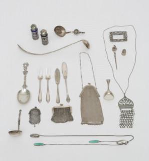 w.b. maliënkolder tasjes, bowllepel en geguillocheerde servethouder, voornamelijk 2e gehalte,