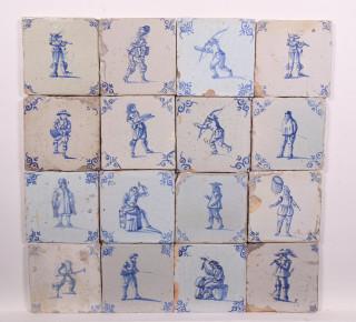 Negenentwintig blauw aardewerk figuurdecor tegels, ca. 1650;