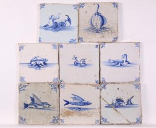 Acht blauw aardewerk dierdecor tegels, 1630-1650,