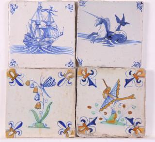 Twee blauw aardewerk en twee polychroom tegels, ca. 1650,