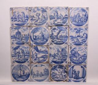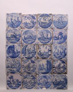 Vierentachtig blauw aardewerk tafereel tegels, vroeg 18e eeuw,