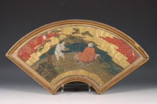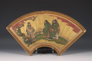 China, two framed paper fans, circa 1900, both painted with sages on a gilt ground, framed behind glass. Condition: the frames with some damages, the fans not examined out of frame, but some small damages and holes visible.