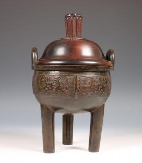 China, bronze archaistic censer, 'ding', Qing dynasty (1644-1912), on three straight legs, the exterior modelled with stylised taotie masks, with wood cover, the interion inscribed 'Pao Ding'. Condition: surface wear as expected, some old small chips to the rim.