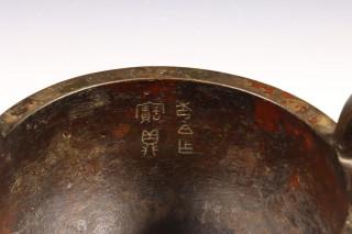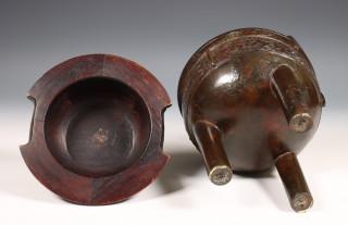 op drie rechte poten, de buitenzijde gemodelleerd met gestileerde taotie maskers, met houten deksel, de binnenzijde met inscriptie 'Pao Ding' (kleine chips)