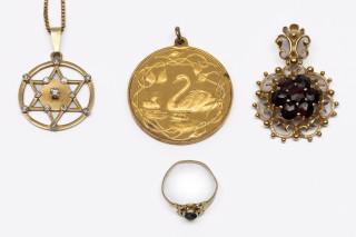 bezet met briljant geslepen diamant, aan een venetiaans collier. Hierbij een gouden hanger met granaat en een verguld zilveren hanger met een zwaan