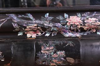 met aan weerszijden een deur. Het geheel ingelegd met parelmoeren voorstellingen van vogels en bloesemtakken. Geen sleutel