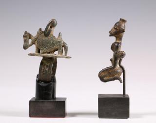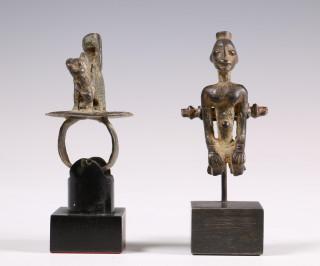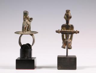 of a seated man with arms bound. On a custom made metal stand. Private Dutch collection. Herewith a bronze ring of a rider on a horse.