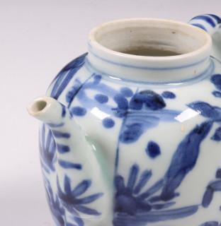 Japan, blue and white porcelain teapot, 18th century, painted with flowers and plants (condition: cover matched, chip to tip of spout)