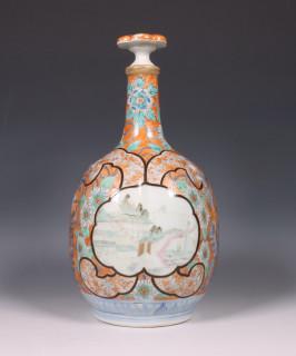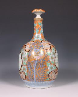 Japan, Kutani porcelan bottle and cover, 19th century, the lobed bottle decorated with panels with pavilions on a ground of birds and flowers, with flower-shaped stopper (condition: apparently in good overall condition)