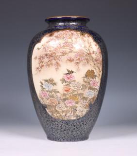 Japan, Satsuma porcelain vase, Meiji period (1868-1912), finely painted with a panel with prunus and chrysanthemum and a panel with hydrangea and lilies on a blue ground with silver flower scrolls, the base signed (condition: minor surface wear and rubbing to gilt)