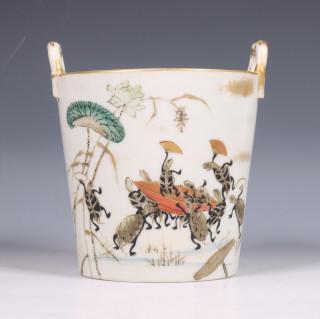 Japan, polychrome porcelain flower-pot, Meiji period (1868-1912), decorated with dancing tortoises in a lotus pond, the base with two series of character marks (condition: small chip to foot rim)