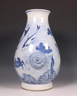 Japan, blue and white porcelain vase, Taisho period, ca. 1920, decorated in tones of cobalt blue with fish and crabs amongst aquatic plants, modelled with a single shell-shaped handle (condition: in good overall condition)