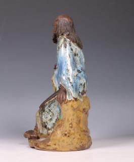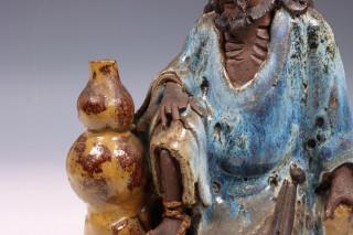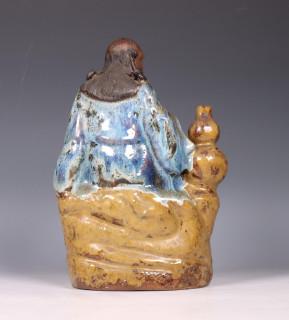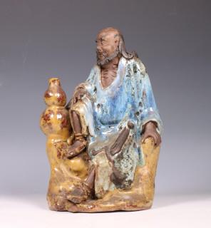 Japan, glazed earthenware figure on a monk, 20th century, dressed in simple clothing and seated on rockwork beside a double-gourd vase (condition: both hands with some fingers chipped away)