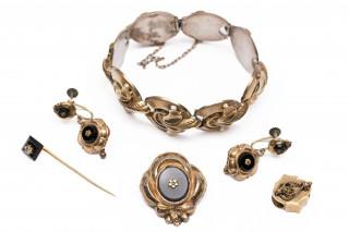 De armband bestaande uit ronde schakels met bladvormen (één los) (tinsoldeer, slijtage). De rest bezet met onix. De reversspeld eveneens gezet met een oud briljant geslepen diamant (chips) (diverse reparaties, tinsoldeer).