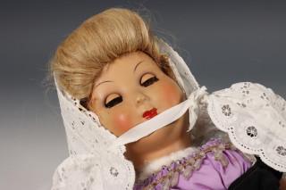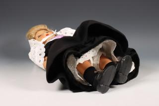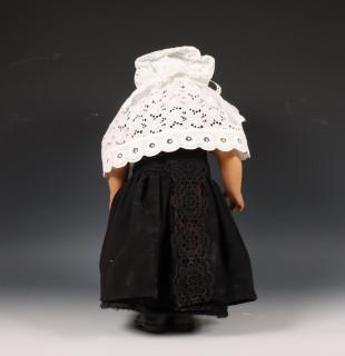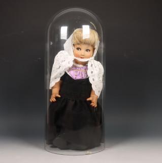 Een papier mache pop in Zeeuwse klederdracht onder glazen stolp.
