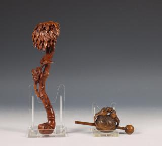 China, wood ruyi-sceptre, 19th/ 20th century, carved in imitation of bamboo, together with a carving of two dragons. Condition: the sceptre with small chips and splits to the wood.