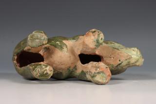 de kop en snuit in reliëf gemodelleerd, bedekt met een deels iriserend groen glazuur